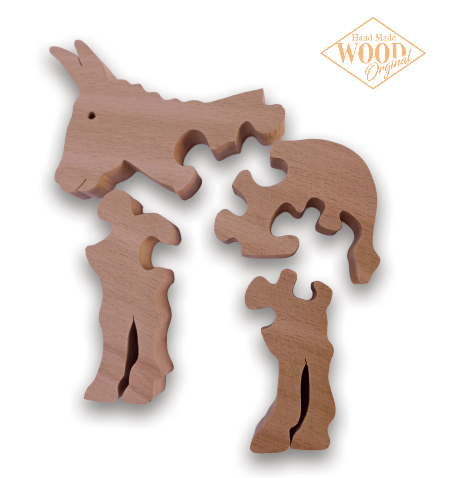 Kayın ağacından üretilen el yapımı, yapboz şekinde Eşek figürü Dört parçadan oluşmaktadır. Pürüzsüz bir yüzey ve boya veya vernik içermeyen figür çocuklar için güvenlidir. Sade ve şık tasarımıyla ev – ofislerinizde dekoratif bir obje olarak kullanılabilir.